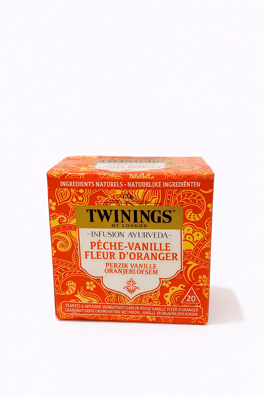 L'Infusion Ayurveda Twinings est une célébration du bien-être composée d'ingrédients naturels soigneusement sélectionnés. Ce mélange unique marie la gourmandise de la pêche, la douceur de la vanille et la délicatesse apaisante de la fleur d'oranger pour une expérience gustative relaxante.